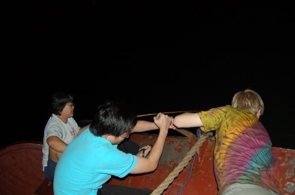 Fishing is done at night while our junk is anchored for the night. Suzanne caught a fish, a small one.