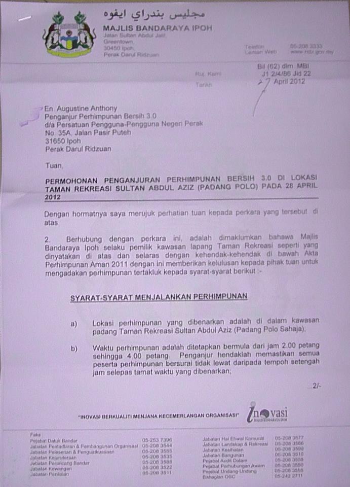 Here is the letter authorizing the Polo Ground as the venue for Bersih 3.o Perak.