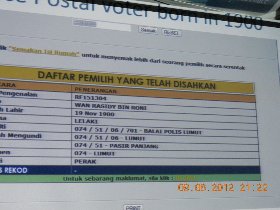 Another example: Encik Wan Rashidy bin Roni is a policeman but his date of birth is 19 November 1900, which makes him 112 years old this year!
