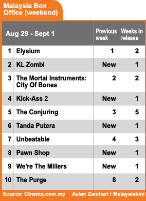An adaptation from a novel, Woo’s comedy, ‘KL Zombi’, starring Zizan Razak, took the number two spot after ‘Elysium’.