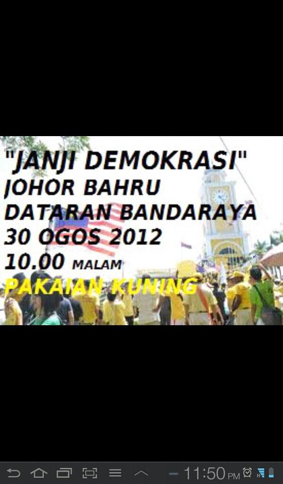 JUMAAT 17 OGOS 2012Gabungan JANJI ialah sebuah gabungan yang dianggotai oleh 49 NGO yang akan bersama-sama dengan anak semua bangsa untuk merayakan ambang kemerdekaan di Dataran Merdeka pada malam 30hb Ogos ini. Di bawah tema “Janji Demokrasi”, Gabungan JANJI akan bersama rakyat Malaysia pada pukul 10 malam di kawasan pancuran air sekitar Dataran Merdeka dengan mengenakan pakaian KUNING sebagai warna tema.Gabungan JANJI juga ingin memaklumkan kepada rakyat bahawa kami bukan mewakili BERSIH 2.0 sepertimana yang telah dilaporkan oleh sesetengah pihak. Tujuan utama kami berkumpul adalah untuk meraikan malam ambang kemerdekaan dengan semangat “Janji Demokrasi”.Justeru, Gabungan JANJI sekali lagi dengan terbuka hati ingin menjemput semua rakyat Malaysia untuk bersama-sama menyambut detik ketibaan hari merdeka yang cukup istimewa kali ini. Kami akan berkumpul di Dataran Merdeka secara aman dan damai bersama anak semua bangsa. Kami juga menyarankan semua rakyat Malaysia, dari Perlis ke Johor serta Sabah dan Sarawak agar memakai KUNING pada malam ambang Merdeka.Kami juga meminta sesiapa sahaja – dalam kota kecil dan besar, dalam kampung dan desa – diseluruh negara untuk keluar pada malam ambang Merdeka dengan memakai KUNING.Pada malam ambang Merdeka di Dataran Merdeka, Sasterawan Rakyat A. Samad Said akan bersama-sama untuk meraikan malam ini dengan mendeklamasikan sebuah puisi istimewa.Akhir sekali, kami dari Gabungan JANJI mengambil kesempatan mengucapkan Selamat Hari Raya Aidilfitri kepada semua yang menyambutnya.Terima kasih.