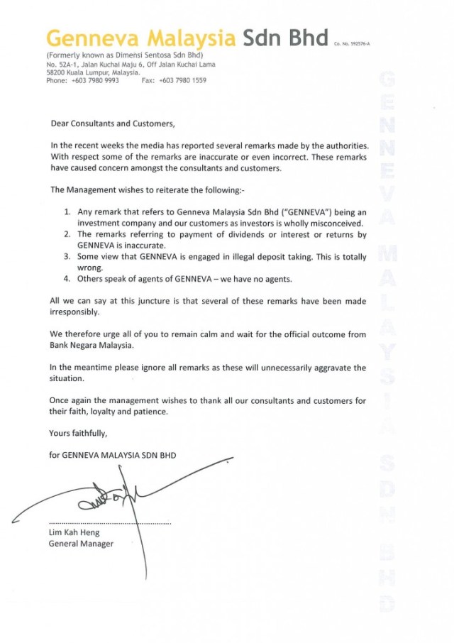 Bank Negara raided Genneva four years ago over a dubious gold trading scheme. Genneva Malaysia and its affiliates were similarly raided on October 1, 2012.