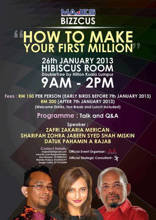 Sharifah Zohra was set to appear on January 26 at the DoubleTree Hotel, part of the Hilton group, in the national capital for a talk titled, “How to make your first million” with two other speakers, retired diplomat Datuk Pahamin A. Rajab and Zafri Zakaria Merican, that charged participants RM200 per person.