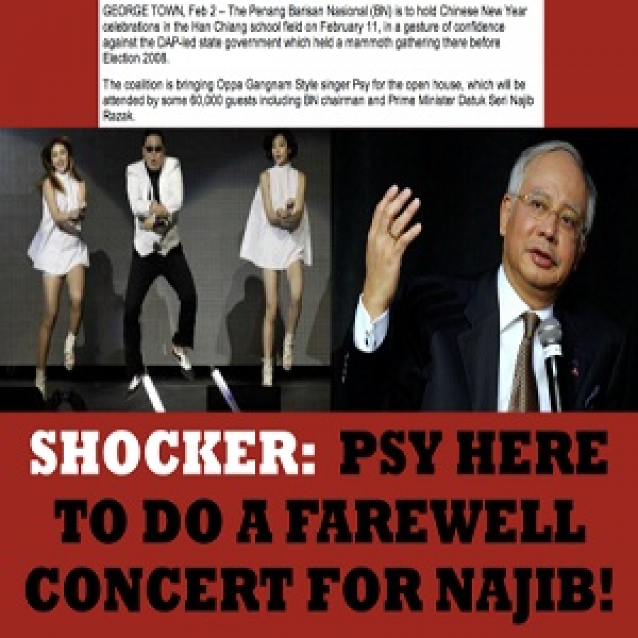 RM2 juta dibayar kepada PSY, penyanyi lagu Gangnam Style dari Korea utk rumah terbuka raya Cina BN bersama Najib di Pulau Pinang.