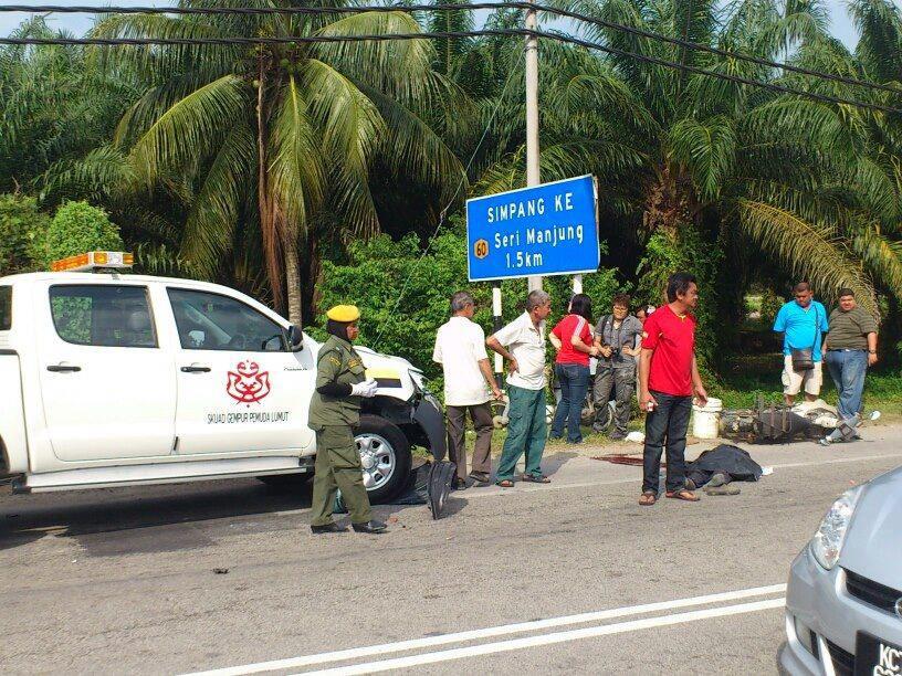 According to China Press, the road accident happened yesterday morning at Lekir, Perak, along the main road from Lekir to Kamunting.