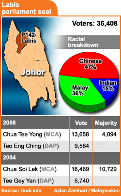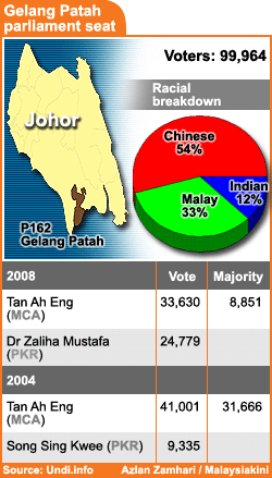 PKR contested in Gelang Patah in the past two general elections, but lost both times to Johor Wanita MCA chief Tan Ah Eng. Tan kept the seat in Election 2008 with a majority of 8,851 votes, a smaller majority than the overwhelming 31,666-vote majority in 2004.