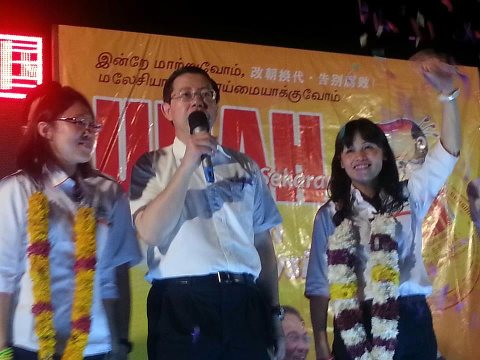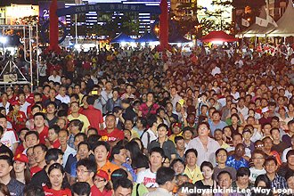 The crowd, mostly Chinese, chant “Wu Yue Wu, Huan Zheng Fu” (May 5, change government) enthusiastically while waiting for the arrival of DAP supremo Lim Kit Siang.