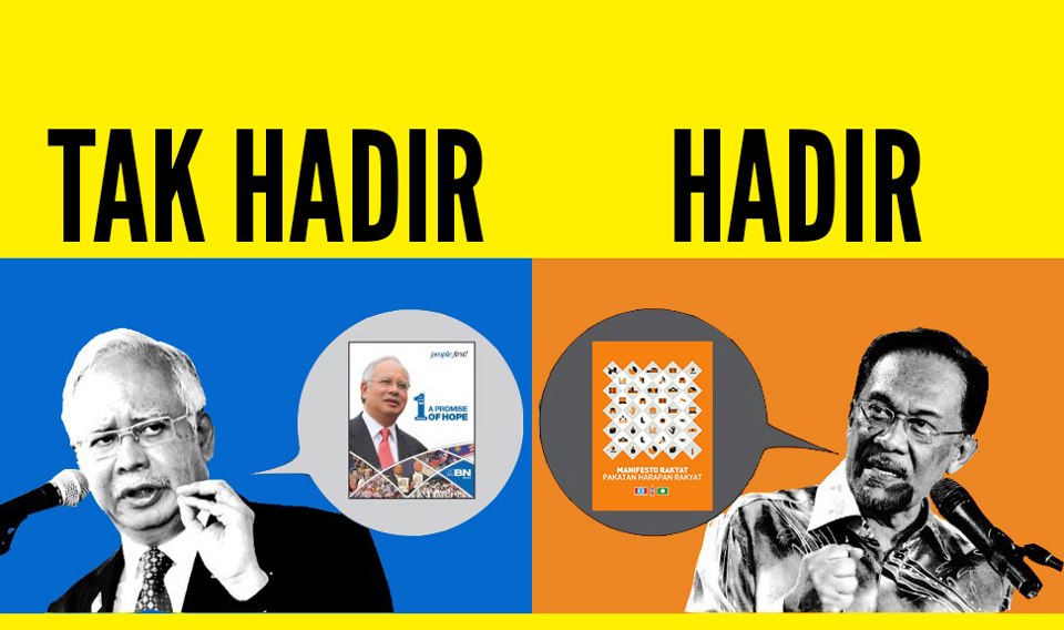 UPDATE2 As expected, Prime Minister Najib Razak failed to turned up at a ‘common conversation’ organized to enable both sides of the political divide to explain to the people their manifestos unveiled for Malaysia’s coming general election.