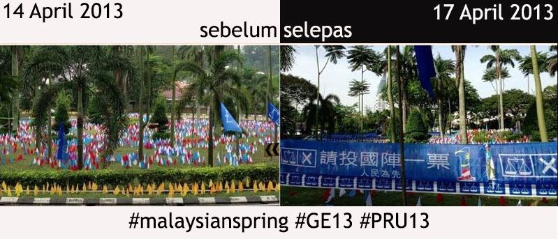 According to several blog posts, the multicoloured flags were allegedly said to represent youth wings of Pakatan Rakyat who would converge at the focal point to start the ‘Malaysian Spring’ on Sunday afternoon if the election results were not in their favour.