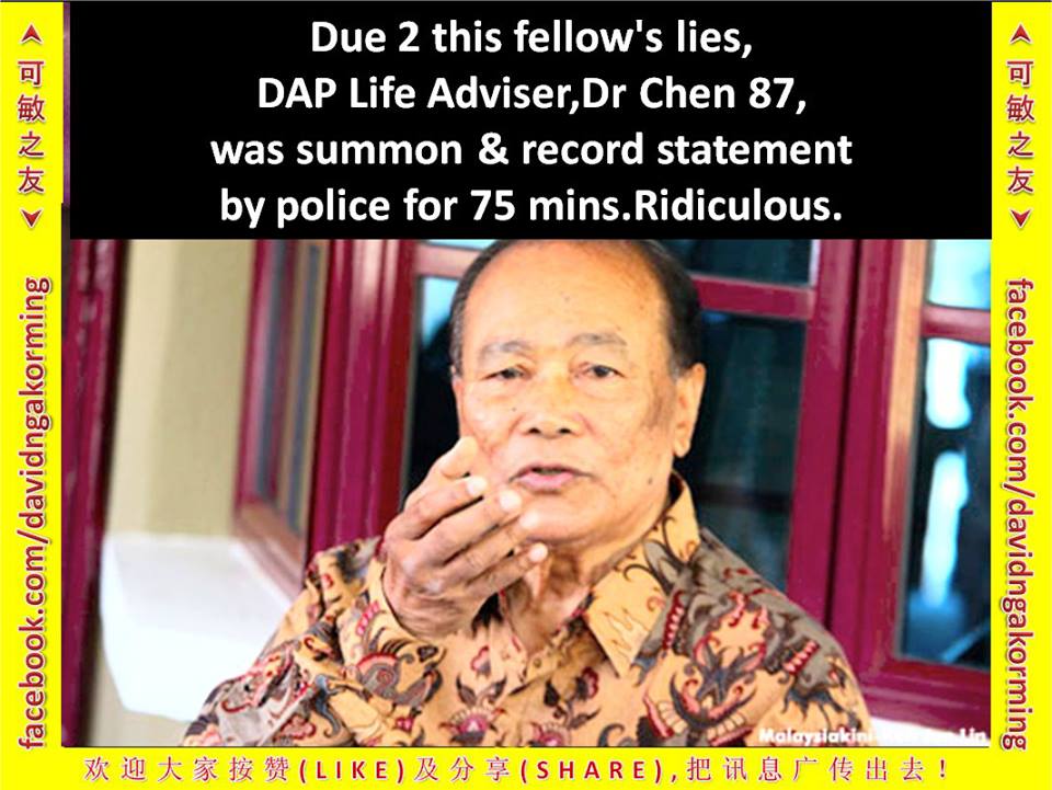 According to DAP’s Bukit Kepayang assemblyperson Cha Kee Chin, who accompanied Chen (left) as his legal counsel, the investigation officer came all the way from Selangor to Seremban to take a witness statement from Chen under Section 112 of the Criminal Procedure Code.
