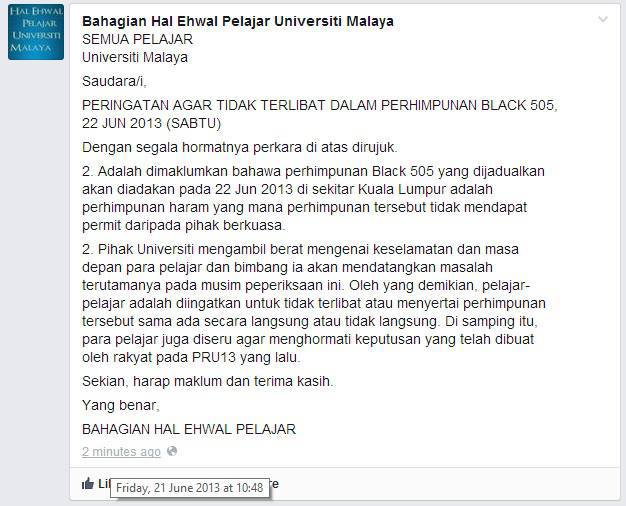 A memo to students from University Malaya says the blackout 505 is Haram!……corruption tak haram ke?