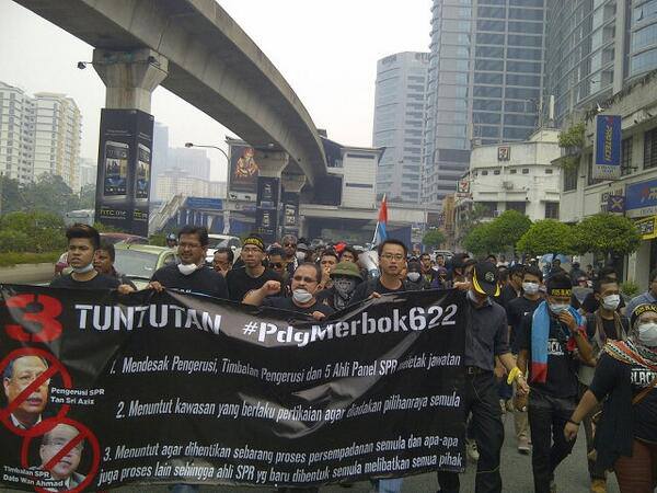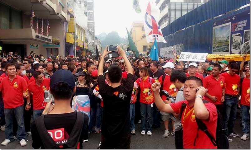 2.12pm: Five hundred strong crowd from Brickfields now marching to Padang Merbok. Crowd chants ” Hidup Rakyat, Jatuh Barisan Nasional”.