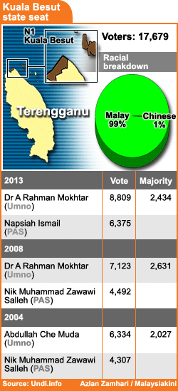 Last May, the late A. Rahman Mokhtar gained 8,809 votes, defeating PAS’s Napisah Ismail who got 6,375 votes, a majority of 2,434 votes.