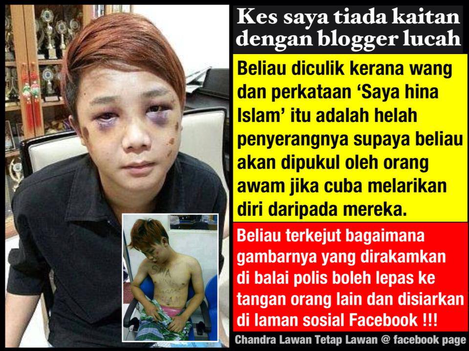Mangsa mendakwa, badannya diconteng oleh suspek kerana perbuatan remaja Cina itu yang mengaku “MENGHINA ORANG MELAYU DAN ISLAM DI LAMAN SOSIAL SEPERTI FACEBOOK DAN TWITTER”