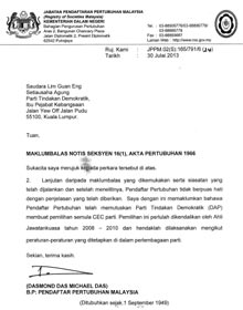 DAP has received the letter issued by Registrar of Societies (ROS) informing the party of its decision to invalidate the party’s central executive committee (CEC) election, however, the letter omits any reason for the decision.