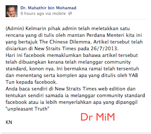 On 26/7/2013, Facebook removed one of Dr Mahathir’s articles.
