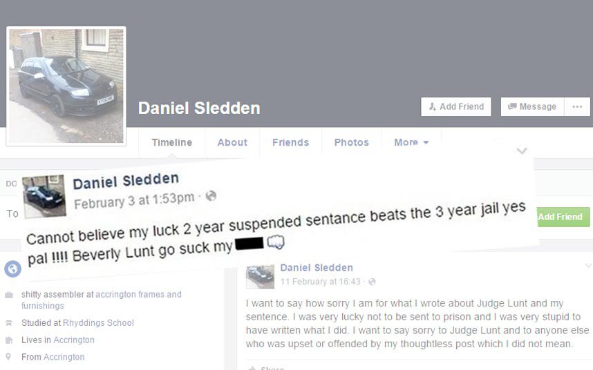 An apology has now been posted to Daniel Sledden’s Facebook page saying: “I want to say how sorry I am for what I wrote about Judge Lunt and my sentence.