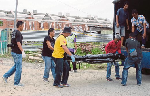 SANDAKAN 15 June 2014. ( KKB537n ) Anggota polis mengangkat mayat anggota PGA yang terbunuh dalam kejadian tembakan, di Sandakan. NSTP/Poliana Ronnie Sidom