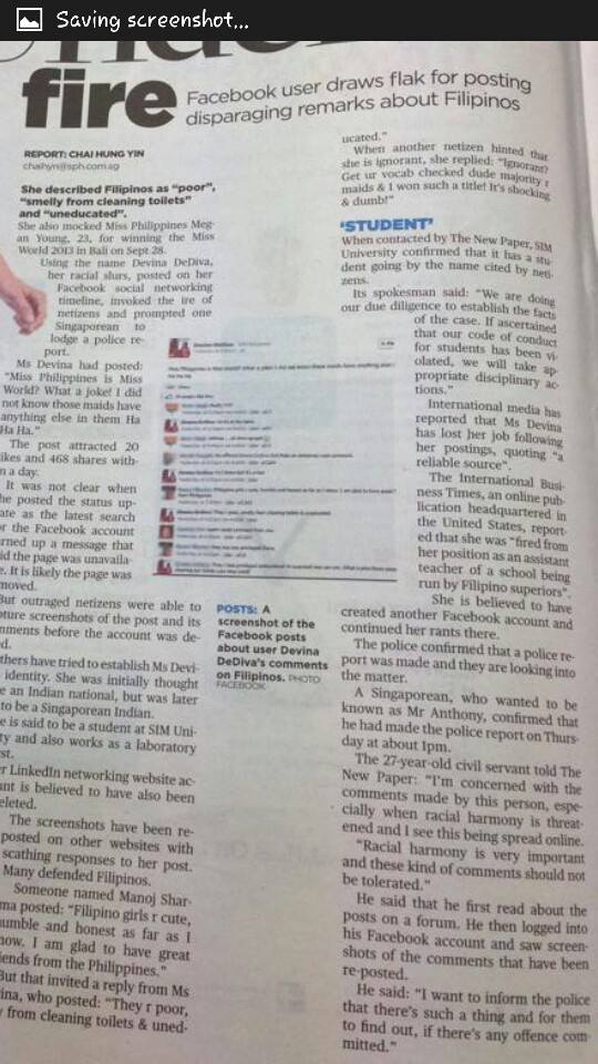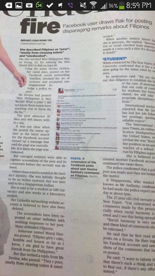 LATEST: SHE LOST HER JOB IN SINGAPORE! It seems that her immediate supervisors are Filipinos, and there is a law in Singapore against posting racist statements online.