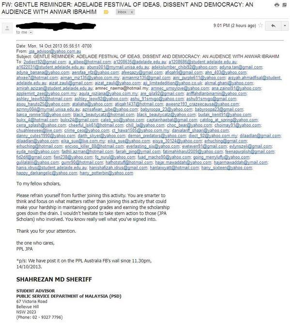 In an email, student advisor Shahrezan Md Sheriff who works at the Malaysian consulate in Sydney warned students on scholarships not to attend the festival session.