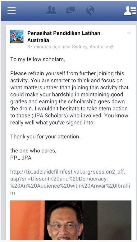 “Sejurus selepas insiden pemegang biasiswa JPA diberi amaran supaya jangan hadir program Anwar Ibrahim di Australia, sekumpulan mahasiswa kita akan membuat bantahan di Universiti Adelaide.