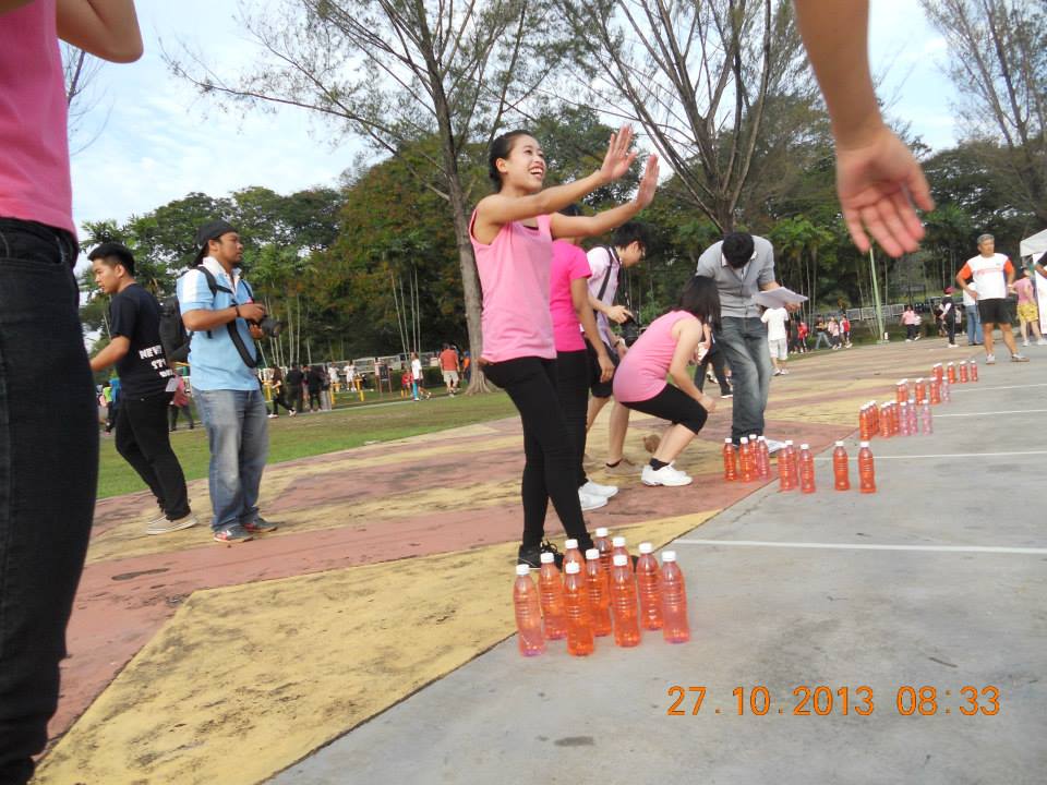 THERE WAS ECO TEN-PINK BOWLING USING COCONUTS AND BOTTLES HOLDING A PINK LIQUID.