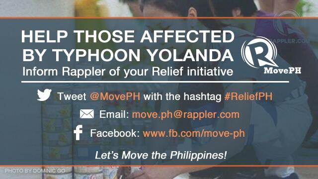 #ReliefPH: Victims of Typhoon Yolanda need your help. A list of ongoing relief operations: http://rplr.co/1gxTGtt pic.twitter.com/ew3qr2r4WW