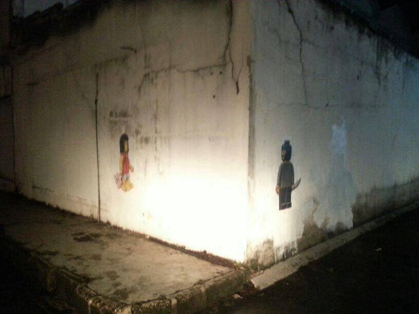 This Lego Mural appeared on the wall of a private building in Johor Bahru. It shows a Lego man brandishing a knife, waiting to rob a Lego woman with a branded handbag.