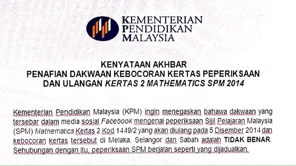 “@idrisjusoh: News of SPM Mathematics 2 paper leak FALSE.SPM on as scheduled. #SPMmaths2014 “Math k2 baik2 je dato’