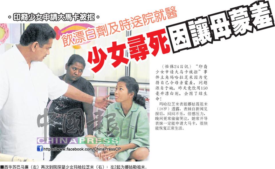 (怡保24日訊)“印裔少女申請大馬卡被拒”事件主角瑪哈拉芝米因為覺得自己令母親蒙羞,問題源自于她,昨天竟飲用150毫升漂白劑,企圖了結生命!