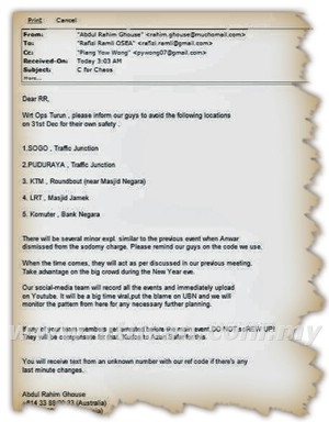The email, addressed to Pandan MP Rafizi Ramli, details the December 31 rally known as Ops Turun with a line that says, “act as per discussed in our previous meeting”.