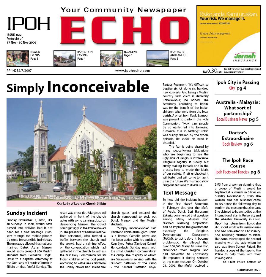 Rumours that were circulated through SMSes nearly jeopardised the peace, harmony and religious freedom experienced by the Catholics of Ipoh. All was well when the Tamil Mass began at 7.OOam on Sunday, November 5, 2006. However by 7.30 am, assistant parish priest Fr Dominic Santhiyagu had realised (from the altar) the mounting presence of police personnel and patrol cars on the main road. The crowd had swelled outside and Federal Reserve Unit (FRU) person¬nel and trucks had arrived and taken up their posi¬tions along the main road in front of the church. Soon the crowd on the right side of the church started shouting, “Kalau Mansor masuk, bakar bangunan ini! ” (If Mansor goes in, burn the building).