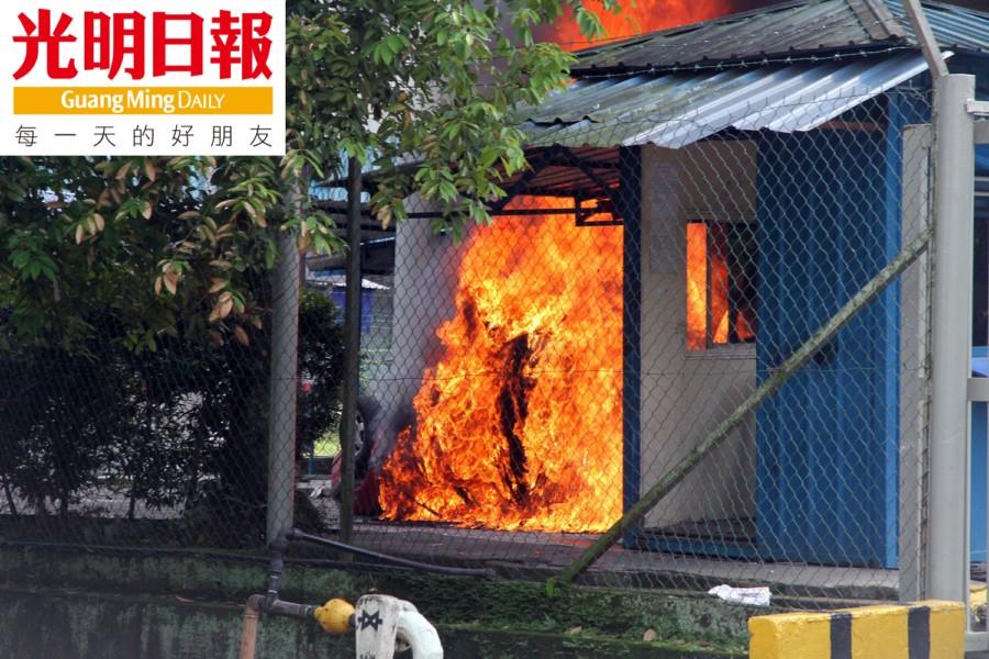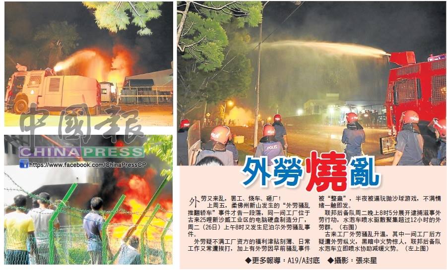 古來工廠外勞騷亂升溫,其中一間工廠后方疑遭外勞縱火,黑暗中火勢驚人,聯邦后備隊水泡車立即噴水協助減緩火勢。