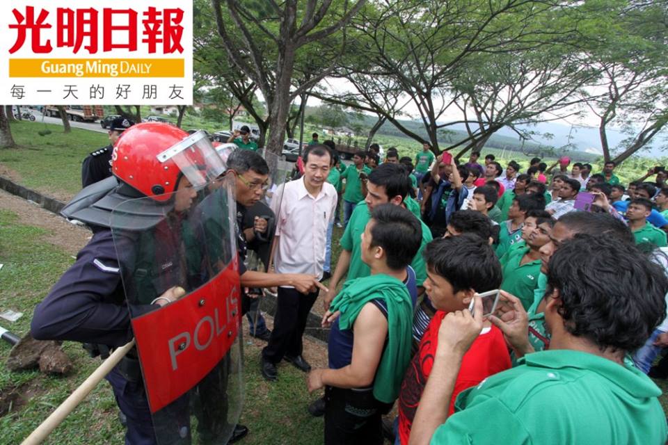 案發時,1500名尼泊爾外勞和少數越南外勞罷工滋事砸廠,包括燒毀位于工廠B座的一輛轎車。左下圖為聯邦后備隊包圍滋事外勞,避免與廠方衝突越演越烈。(攝影:張來星)http://www.chinapress.com.my/node/555163