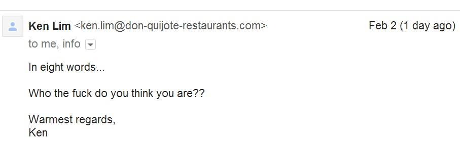 “In eight words, who the fuck do you think you are?”We are constantly complaining about the lack of service culture in Singapore and attribute it to a general lack of staff in the industry. Sure, the lack of staff is one reason – less staff, lower standards of service. We’re in an industry wide crunch and everyone’s trying their best to cope. So Mr Ken, I do understand where you’re coming from. What better way to save time on service recovery then a templated “Fuck you?”Of course it does not help when owners themselves validate bad service but Mr Ken, I’m neither mad nor upset about your reply. I’d just like a glass of whatever you were drinking.