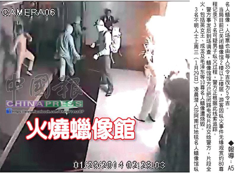 3名不明人士上週三(1月29日)凌晨潛入莎阿南紅地毯名人蜡像館縱火,包括英女王、成龍及毛澤東等10尊名人蜡像遭燒燬。