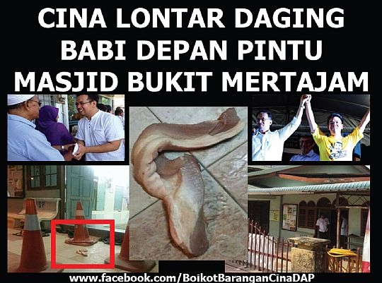The Facebook page under the name “Boikot Barangan Cina DAP” showed a picture of Sim under the headline “Cina lontar daging babi depan pintu masjid Bukit Mertajam” [Chinese lobbed pork in front of Bukit Mertajam mosque entrance) on February 17.