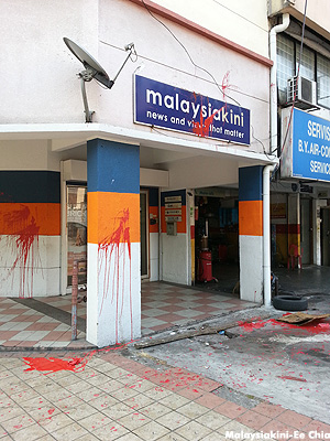 The paint was thrown on the walls and floor, as well as the Malaysiakini signboard, at the four-storey building. A motorcycle parked nearby was also splattered with the paint.