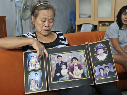 Suwarni, the mother of Sugianto Lo, who was onboard the missing Malaysia Airlines Flight 370 with his wife Vinny, shows her son’s family portraits at her residence in Medan, North Sumatra, Indonesia on March 25, 2014.(Photo: Binsar Bakkara, AP)