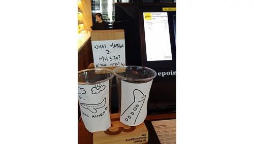 One cup at the Artisan Boulangerie Compagnie’s Asia Square branch showed the tail of a plane diving downwards. The other showed a jet cruising in the clouds with a caption reading “Still alive!” A sign next to them read: “What happen 2 MH370?” — PHOTO: FACEBOOK
