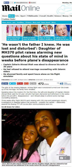 2 The UK’s Mail on Sunday reported the Malaysian police were investigating the possibility that the pilot of missing Flight MH370 had hijacked his own aircraft in a bizarre political protest.