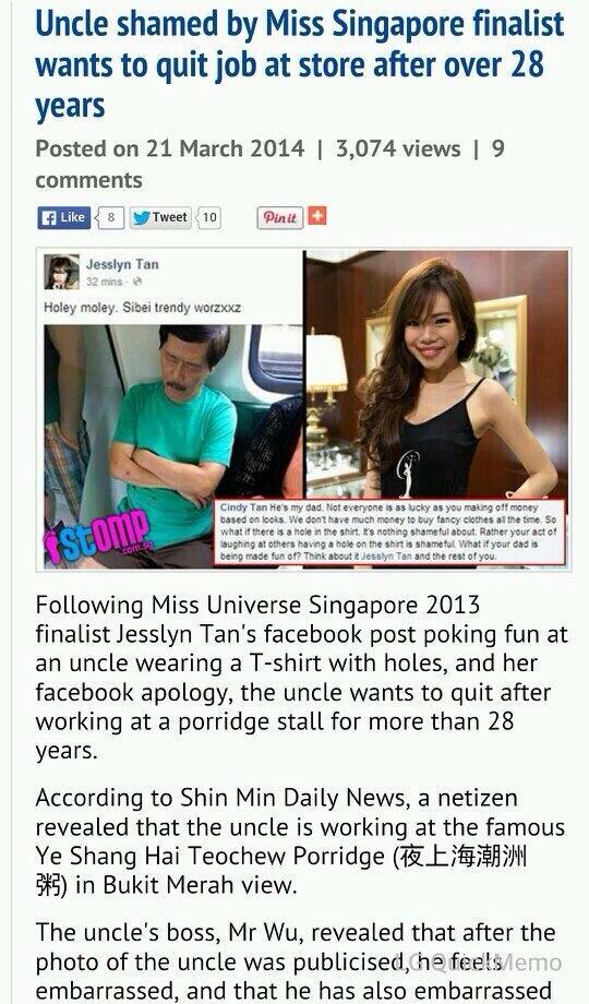 Following Miss Universe Singapore 2013 finalist Jesslyn Tan’s facebook post poking fun at an uncle wearing a T-shirt with holes, and her facebook apology, the uncle wants to quit after working at a porridge stall for more than 28 years.