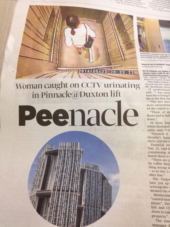 Singapore’s Tanjong Pagar Town Council posted pictures of a woman urinating in a Housing Board flat building lift in posters around the Pinnacle@Duxton estate.