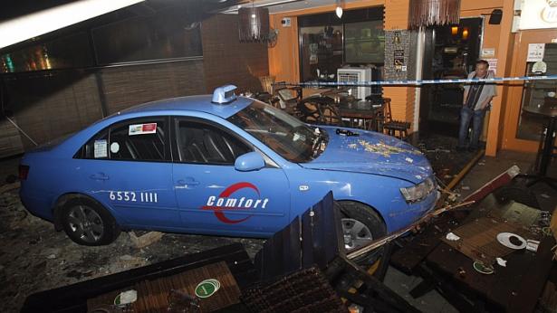 This taxi hit another car, went through the wall of the cafe next door, and ended up here. Five of the six patrons were taken to hospital.