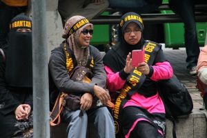 The women were dressed about the same, with many in long tudungs. Others were in combat pants and boots, some had brought along gas masks.