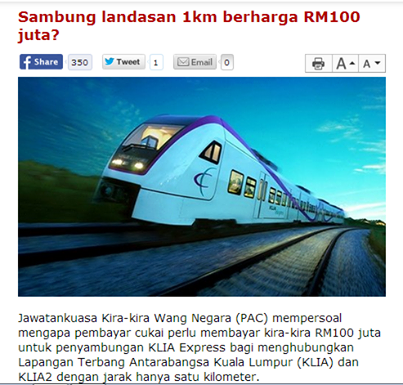 The Public Accounts Committee (PAC) has raised its concerns over the RM100 million price tag to extend the KLIA Ekspres rail line by only 1km to link the KL International Airport (KLIA) and klia2.