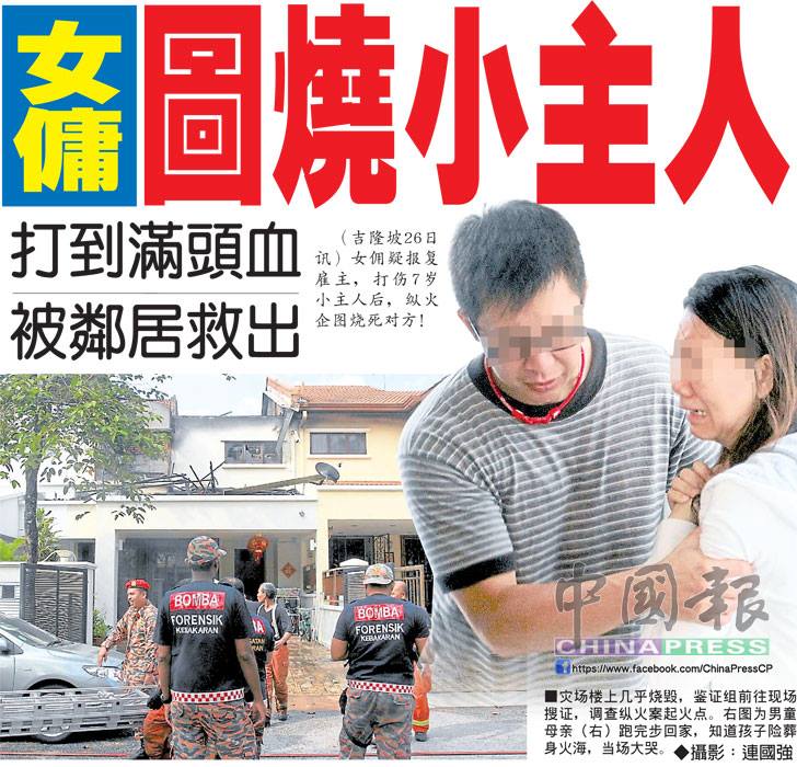 (吉隆坡26日訊)女佣疑報復雇主,打傷7歲小主人后,縱火企圖燒死對方!http://www.chinapress.com.my/node/538384