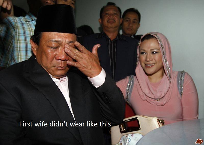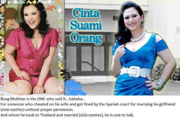 —– BUNG MOKHTAR, CONVICTED OF POLYGAMY! the Sun daily KUALA LUMPUR (April 20, 2010): The Member of Parliament for Kinabatangan, Datuk Bung Moktar Radin and his wife, actress Zizie Izette Abdul Samad, pleaded guilty at the Gombak Timur Lower Syariah Court, here to the charge of committing polygamy without the court’s permission, at the end of last year. Bung Moktar, 51, was accused of committing the offence with Zizie, 31, at house No 12, Jalan TC2B/3 Cemerlang Heights, Taman Melati, Gombak at 8.50pm on Dec 16, last year. … Zizie was also charged under Section 40 (2) of the same Enactment for marrying Bung Moktar without the consent of the Registrar of Marriage, Divorce and Reconciliation at the same place, time and date. In addition, Zizie was also accused of abetting Bung Moktar in committing polygamy without consent of the court while Bung Mokhtar was accused of abetting Zizie in marrying without the court’s consent. http://www.thesundaily.my/node/143914 … Polygamy Conviction On 20 April 2010, Bung Mokhtar pleaded guilty to committing polygamy.[9] He was then sentenced to a one-month’s jail by the East Gombak lower Syariah Court on 19 May 2010. He was also slapped with a RM1,000 fine or one month’s jail in default on a second charge of abetting actress Zizie Izette Abdul Samad to marry without the consent of a Syariah registrar. It was reported during the court hearing, Bung Mokhtar and his illegitimate wife, Zizie Izette, did not show any remorse, were generally gay and casually chatted with journalists. They then subsequently drove off in a Porsche Cayenne. Malaysian politicians are required to use only nationally-produced Proton cars. The issue of Bung Mokhtar entering into an illegal polygamous marriage without fulfilling the required procedures and conditions under the Islamic Family Law (Selangor) Enactment 2003, generated a chorus of criticism from women’s groups, who demanded his resignation.[10][11][12] On 11 August 2010, Bung Mokhtar was let off with a RM1,000 fine in lieu of the jail sentence while Zizie was fined RM1,000 or one month’s jail in default for marrying without the consent of a Syariah registrar.[13] References • “Bung Mokhtar: Lawmaker or breaker?”. The Nut Graph. • “Protesters greet Bung Mokhtar outside court”. The News Straits Times. • “Law breakers must resign”. Women’s Aid Organisation. 22 June 2010. Retrieved 22 June 2010. • “Bung Moktar escapes jail time, fined RM1,000”. The Star. 20 April 2010. http://en.wikipedia.org/wiki/Bung_Mokhtar_Radin … Malaysiakini 10:05AM Aug 11, 2010