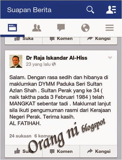Salam. Dengan rasa sedih dan hibanya di maklumkan DYMM Paduka Seri Sultan Azlan Shah . Sultan Perak yang ke 34 ( naik taktha pada 3 Februari 1984 ) telah MANGKAT sebentar tadi . Maklumat lanjut sila ikuti pengumuman rasmi dari Kerajaan Negeri Perak. Terima kasih.