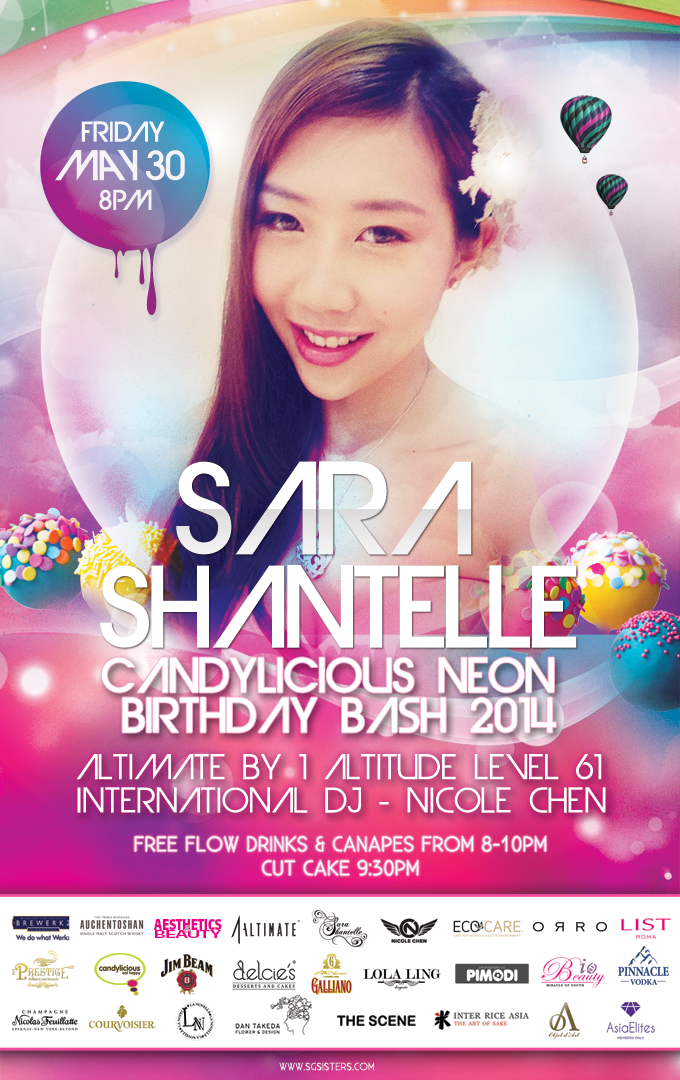 Sara Shantelle Lim was quoted in a press release stating that she will celebrating her 27th birthday on Friday this week with “the biggest ‘Candylicious Neon’ themed party in Singapore” and has received over $40,000-in-kind sponsorships for the private bash.